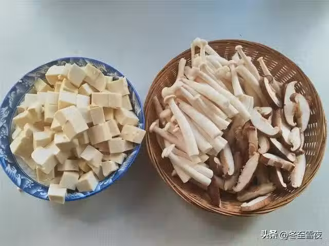 2.把豆腐切成小塊,海鮮菇切去根部,投洗乾淨,再切成兩段,香菇切去根部,再切成片,蔥切蔥花,姜切末。