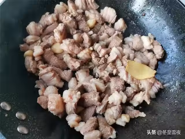 4.鍋加油燒熱,下入薑片、蒜粒,炒香,再下入羊肉塊翻炒,將羊肉塊翻炒至顏色變白,淋入料酒翻炒均勻。