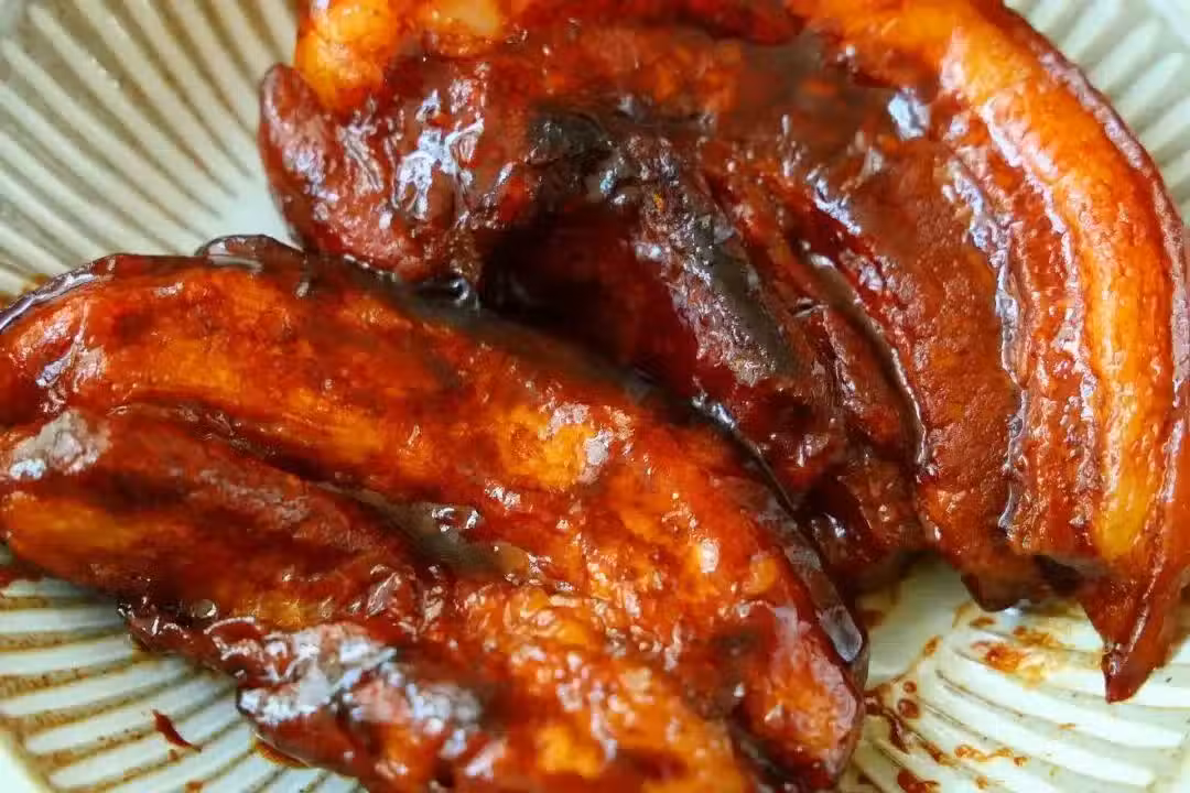 6、將烹飪好的叉燒五花肉取出,稍微放涼一下,然後切成薄片或小塊。此時,你會發現五花肉的表皮已經變得酥爽可口,而肉質則柔軟多汁。將切好的叉燒五花肉擺放在盤中,淋上剩餘的醬汁,讓每一片叉燒都充分吸收醬汁的味道。