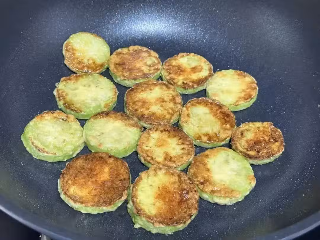 當茄子片煎至金黃色時,將其取出放在一旁備用。在熱鍋中倒入少許涼油,放入蒜末炒香。接著,將調好的醬汁倒入鍋中,用小火煮開至冒泡。