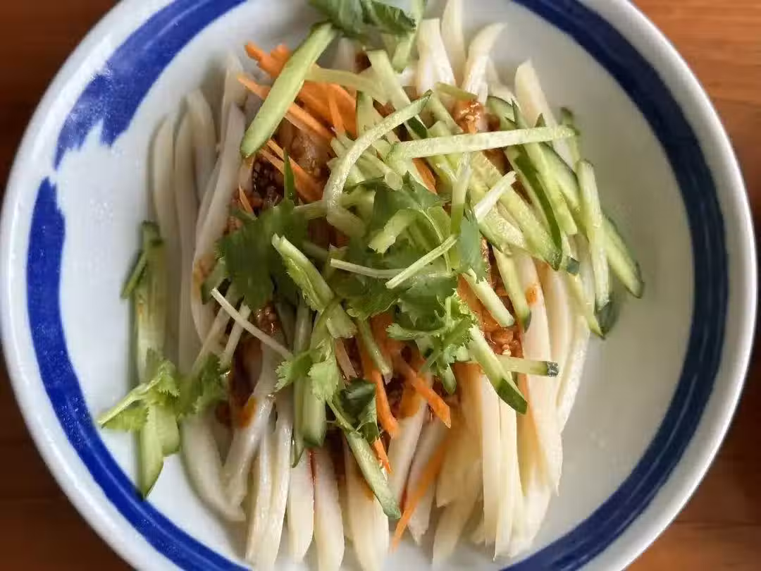 7、一份清爽美味的涼皮就做好了!這款涼皮不僅口感勁道爽滑,而且做法簡單方便,非常適合夏天食用。無論是作為主食還是小吃,都能讓你感受到一份清涼與美味。
