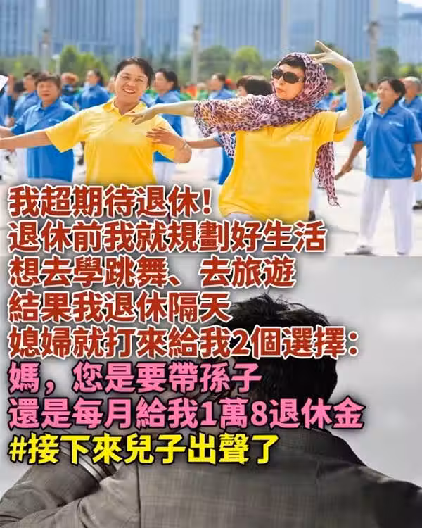我超期待退休!退休前我就規劃好生活,想去學跳舞、去旅遊,結果我退休隔天媳婦就打來給我2個選擇:「媽,您是要帶孫子,還是每月給我1萬8退休金」#接下來兒子出聲了😲