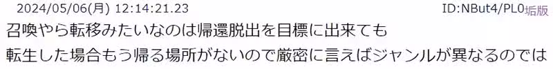 「《.hack》和《刀劍神域》是虛擬實境,《夢幻遊戲》和《魔法騎士雷阿斯》是轉移,近年的轉生套路則大多都是轉生,所以只是單行道。不過也是有再再轉生或再度轉移的龍傲天例子啦。」