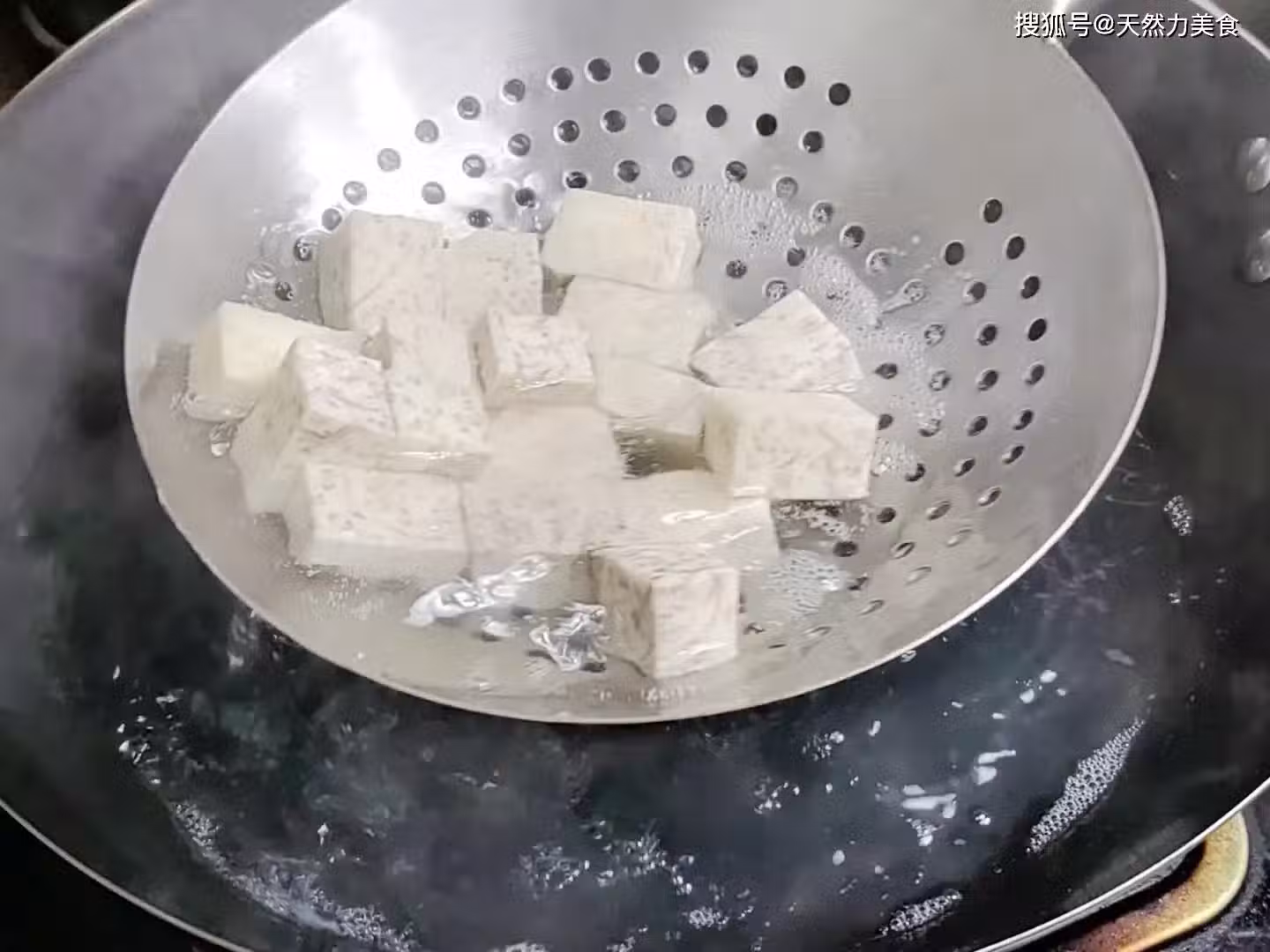 9、香芋撈出後馬上倒進冷水中過冷,這樣做可以讓香芋降溫,防止香芋繼續熟化,也可以讓香芋的口感更好,等香芋冷卻後撈出控水備用。注意,香芋控水別控太干。
