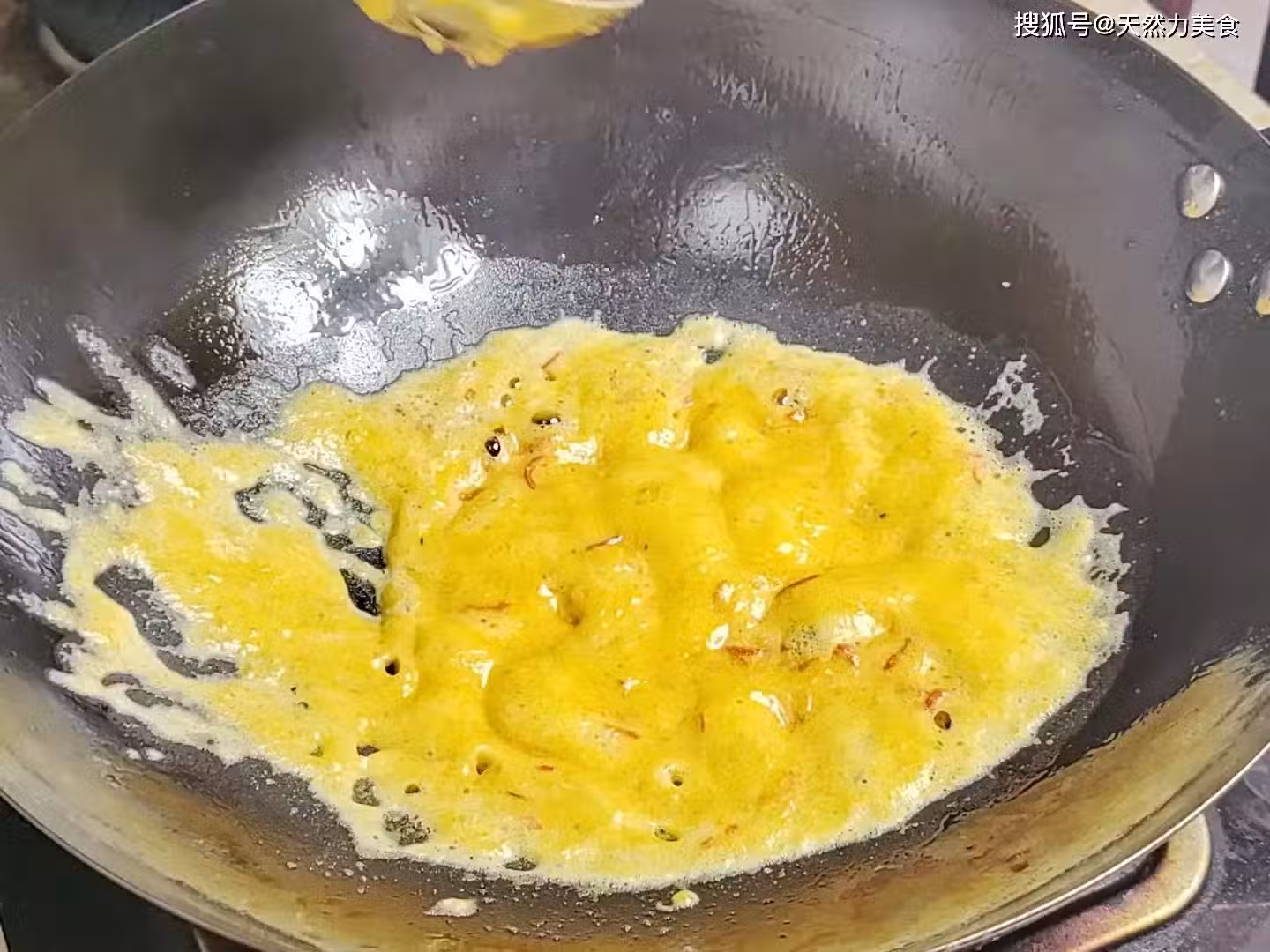 16、一直把鹹蛋黃炒到起泡泡的狀態,就說明火候到了。把炸好的香芋倒入鍋內,翻炒均勻,讓所有的香芋都能均勻地裹上一層鹹蛋黃,這個過程不需要炒太久,只要香芋裹好蛋黃後就可以出鍋。