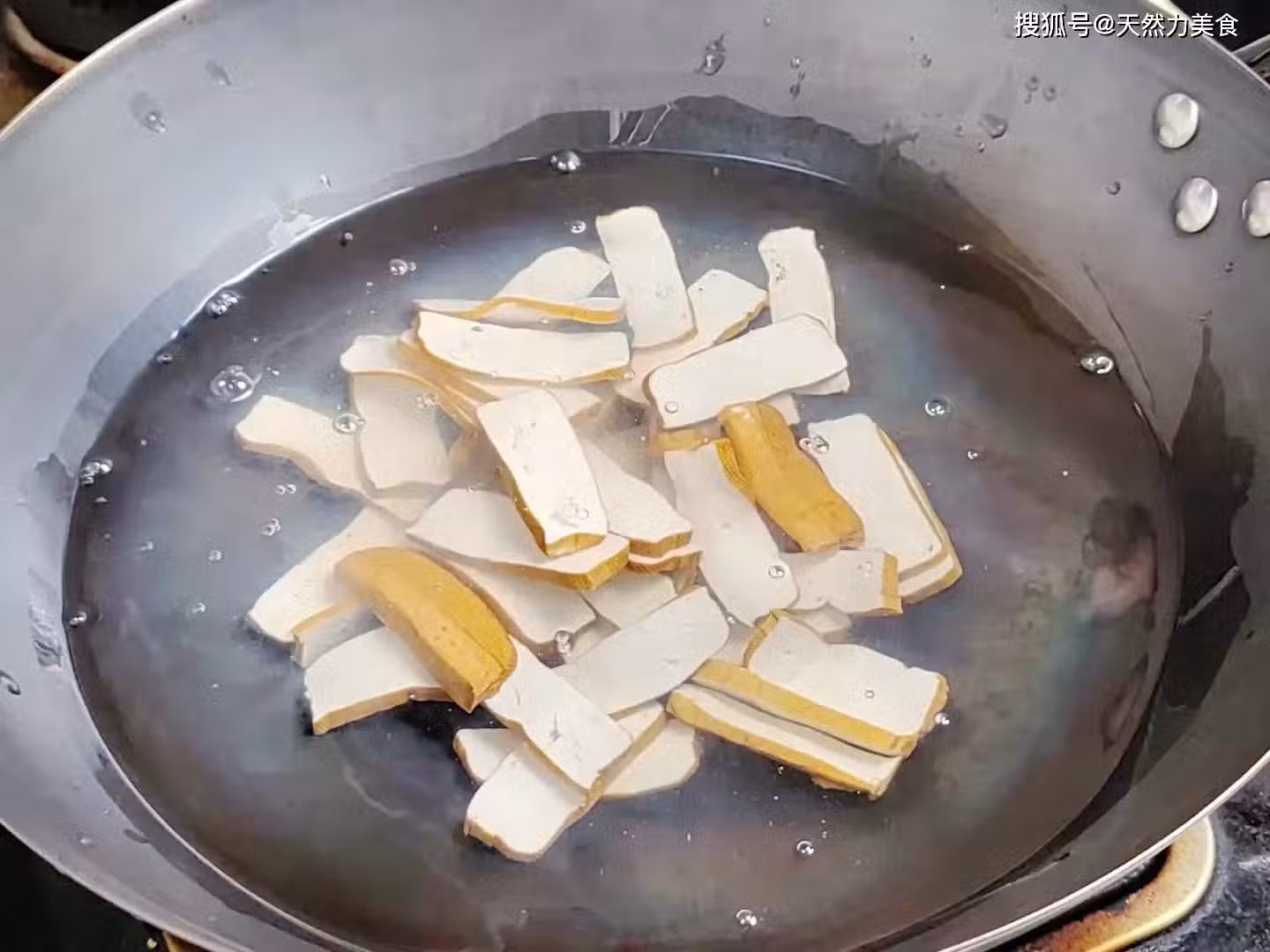 13、香乾焯水全程大火,當看到鍋中的水沸騰後計時1分鐘,期間稍微攪拌幾下就可以。香乾焯水1分鐘後就可以倒出控水備用。