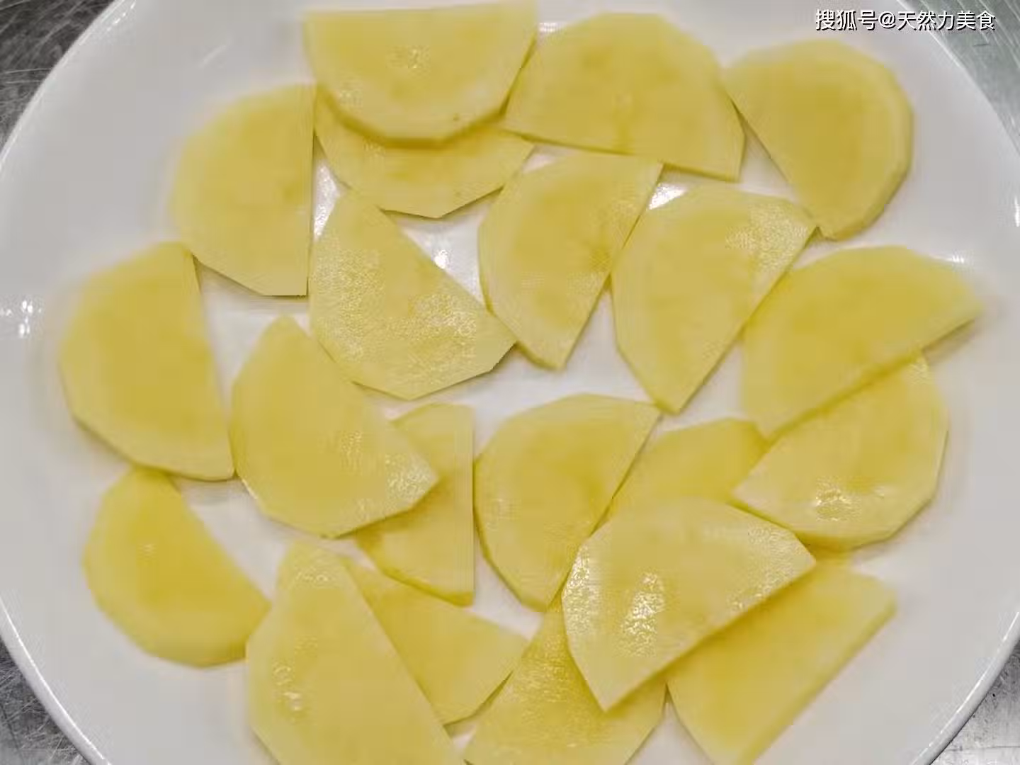 9、接著把腌制好的魚頭平鋪在土豆的上面,放的時候儘量把魚皮朝下,這樣可以更入味,注意是平鋪,最好不要疊放在一起。