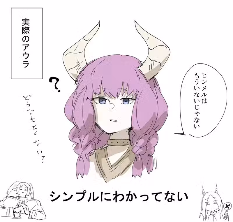 「ポテトルス」舉出了阿烏拉的名台詞「欣梅爾已經不在了」當例子。他從同人二創當中認識的阿烏拉,在講出這句話的時候,都是帶有相當嘲諷的語氣。因此讓他誤以為阿烏拉在原作當中,就是一個愛開嘲諷的傢伙啊!