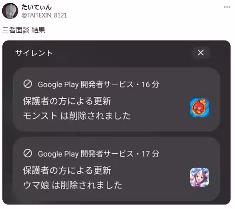 一位暱稱「たいてぃん」的日本X網友,最近分享了自己跟老師、家長舉行三方會談之後,自己愛玩的手機遊戲被家長的帳戶動用監護權限,遭到強迫刪除的事情,引發網友們的熱烈關注……