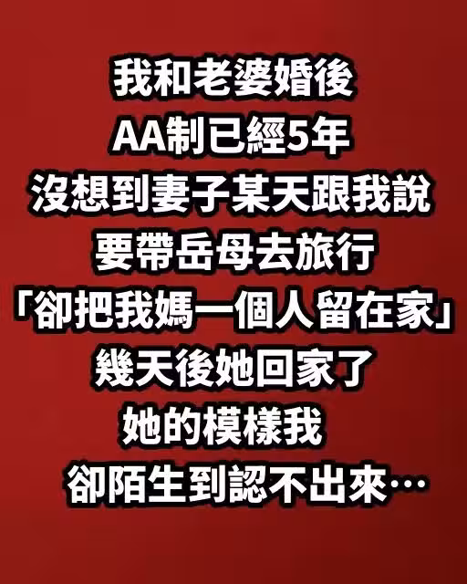 我和老婆婚後AA制已經5年,沒想到妻子某天跟我說,要帶岳母去旅行「卻把我媽一個人留在家」,幾天後她回家了,她的模樣我卻陌生到認不出來~