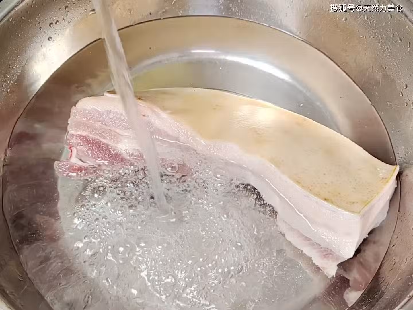 4、接下來就要對五花肉進行改刀了,改刀也是有技巧的,來看看這個五花肉的紋理,如果我們順著紋理來切的話,吃起來就容易塞牙,所以我們要逆著瘦肉的紋理來切,這樣就可以把瘦肉的筋膜切斷。