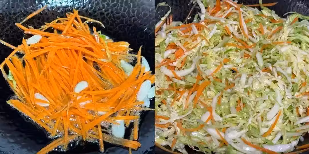 5、待包菜絲稍微變軟後,將之前炒好的鵝蛋和拌好的粉絲一併加入鍋中。接下來是調味的關鍵時刻。加入生抽2勺、老抽1勺、鹽1勺、蚝油1勺、陳醋1勺,並撒上適量的白鬍椒粉。這些調味料不僅為菜肴增添了豐富的口感,還使菜肴的色澤更加誘人。