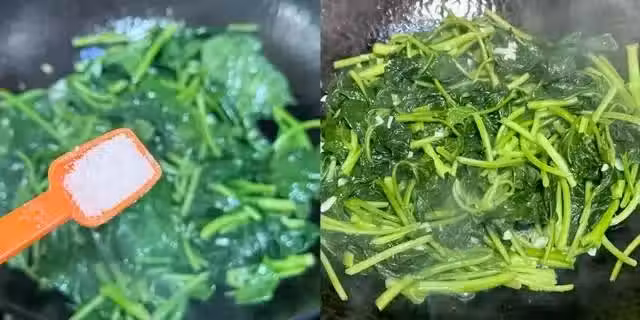 6、炒制青菜時,火候的掌握至關重要。過長的炒制時間不僅會導致營養流失,還會影響口感。因此,在紅薯葉變軟後,應立即出鍋裝盤。如果感覺有些干,可以適量加入一些清水,這樣炒出的紅薯葉口感會更加鮮嫩可口。