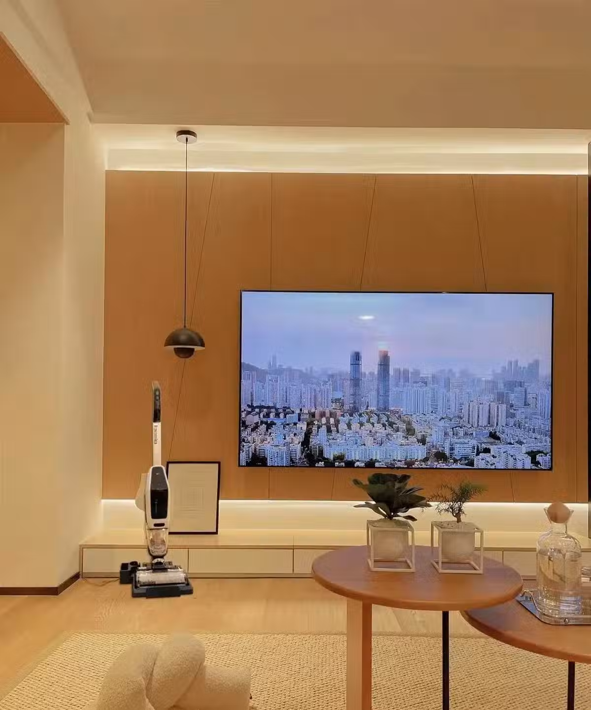 電視背景墻使用的是白橡木色科定版,電視機中心線離地面1100mm,電視底部離地面580mm,電視選擇壁掛式真的大氣很多,電視櫃的台面也可以騰出來放置物品,增加裝飾與收納空間,電視櫃封邊用的是黑色壓邊條處理。