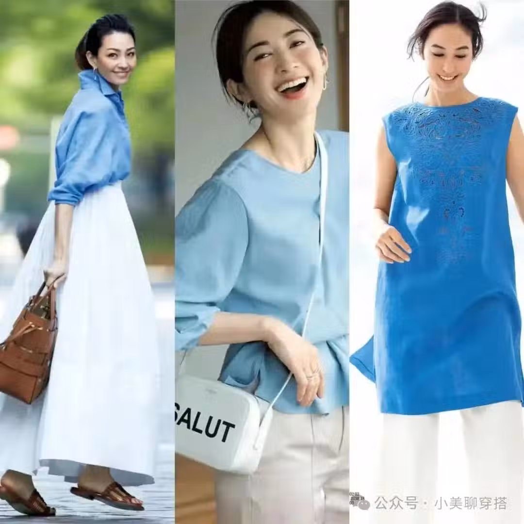 藍色是屬於夏天的,也是屬於成熟女性的。藍色,代表著靜謐、清新,它自帶一種清涼感,藍色又是特別高級的顏色,顯白的效果非常好,適合黃黑皮。