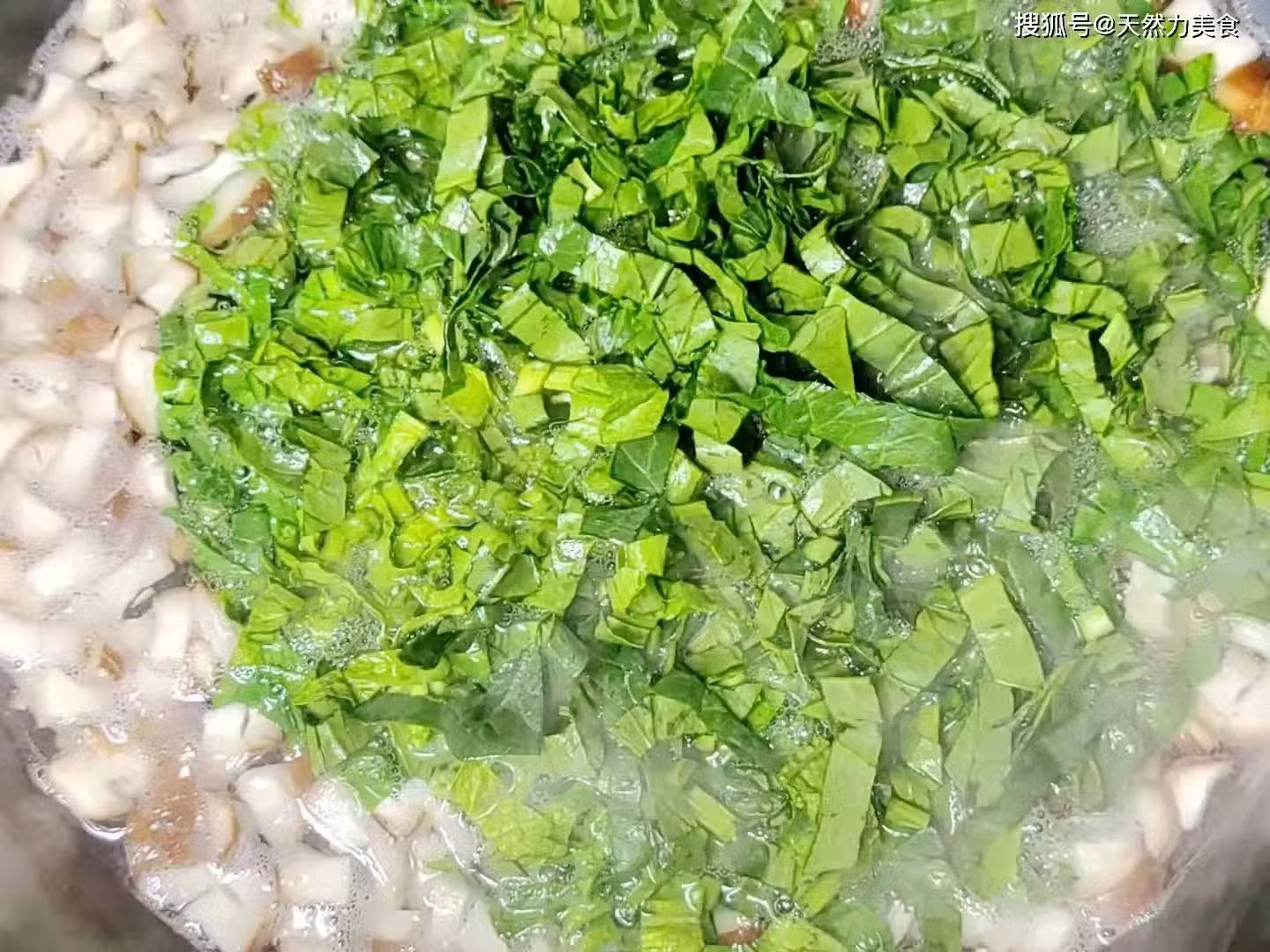 2、重新起鍋,把鍋燒熱後加入10克花生油,稍微等上幾秒後再加入1500克清水進去,大火把水燒開,水沸騰後把香菇、日本豆腐和菠菜一起倒入鍋內。