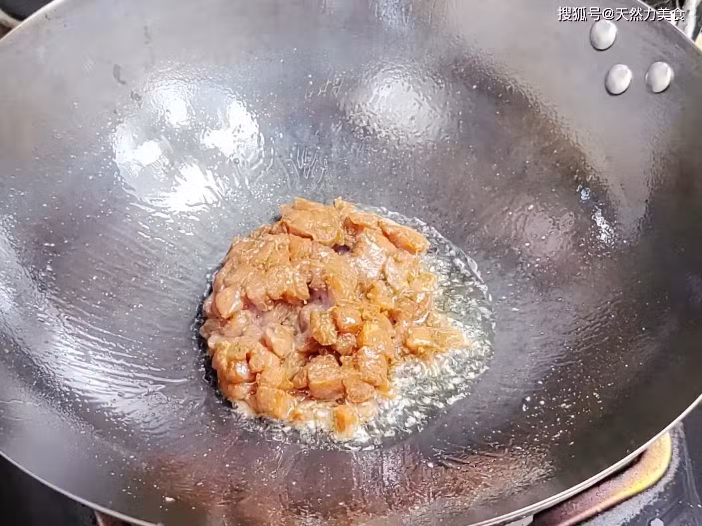 4、接著把蒜末、薑末和小米椒一起倒入鍋內,和肉丁一起炒出香味,這個過程大概有15秒左右香味就能出來。