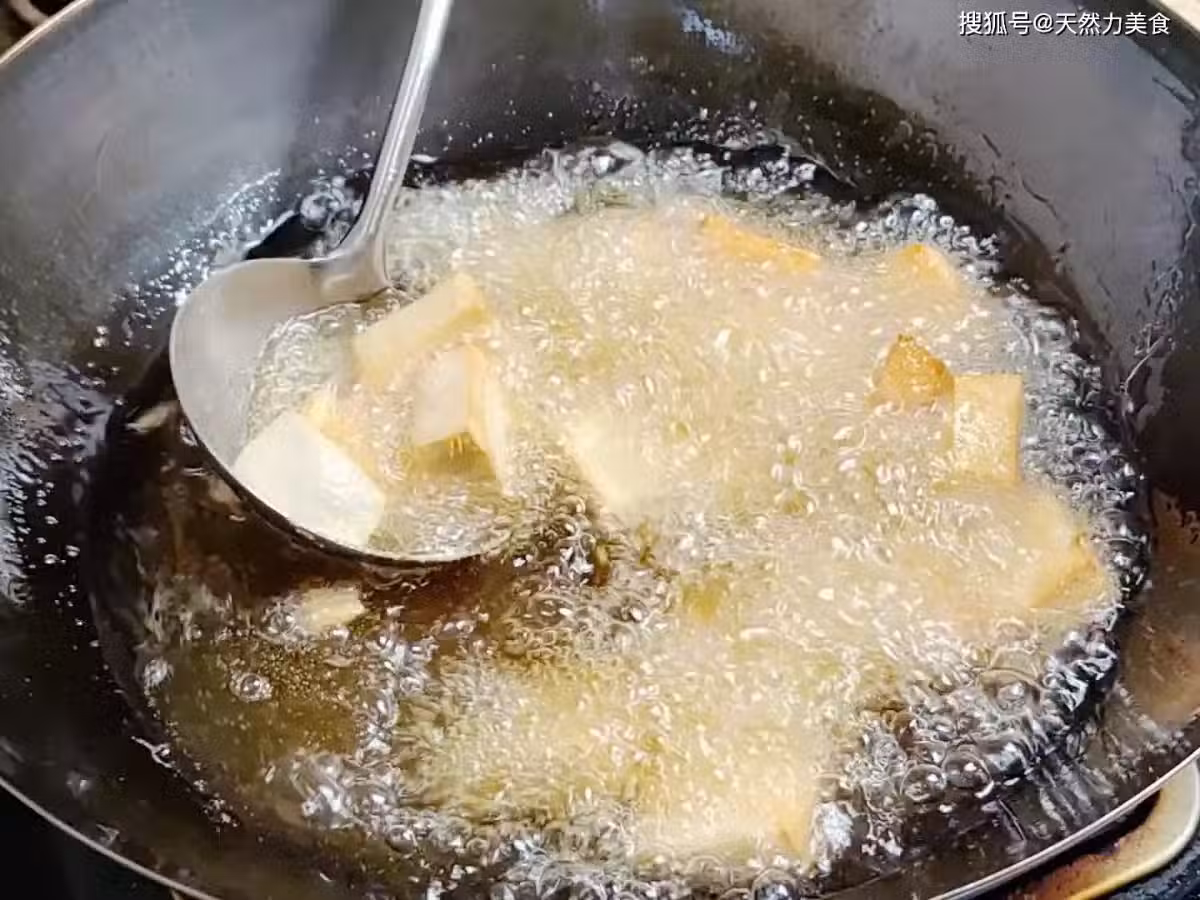 3、一直把豆腐炸到外表有一層金黃色的硬殼就可以撈出控油,整個過程我大概用了2分鐘左右。很多朋友會說油炸豆腐太耗油了,其實我們炸過豆腐的油燒沒有任何異味的,還可以正常用來炒菜,一點都不浪費。