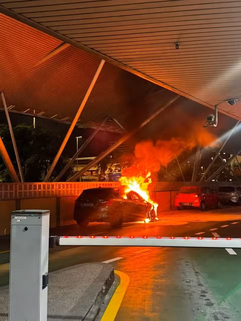 (新山8日訊)一對新加坡夫婦共車返回獅城時,轎車突然在新山關卡內起火,現場官員馬上使用滅火器撲滅火患,有驚無險!
