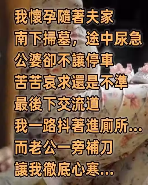 我懷孕隨著夫家南下掃墓,途中尿急公婆卻不讓停車,苦苦哀求還是不准,到達休息站,我一路抖著進廁所…而老公一旁補刀讓我徹底心寒…