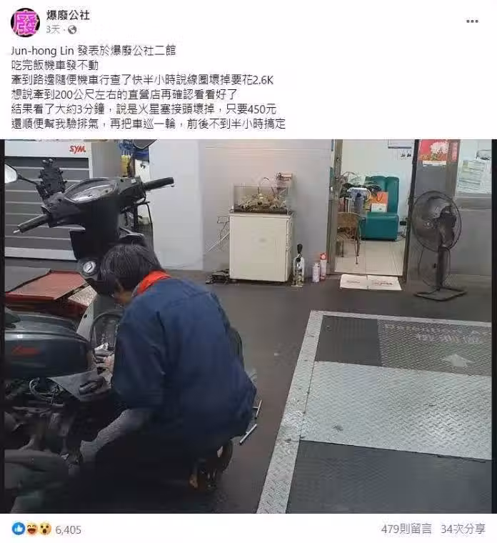 「看了大約3分鐘,說是火星塞接頭壞掉,只要450元,還順便幫我驗排氣,再把車巡一輪,前後不到半小時搞定。」同樣的問題,兩家店卻給出相差好幾倍的報價,讓原PO覺得疑惑,對此,網友們都回:「好的店家帶你省錢去!爛的店家帶您入錢坑!」、「貨比三家不吃虧!」、「把你當客戶VS把你當盤子豬仔。」