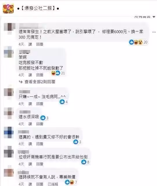 其他網友則分享:「之前火星塞壞了,說引擎壞了,修理要6千,換一家3百搞定!」