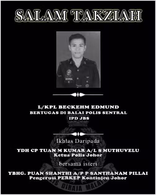 柔佛州總警長M.古馬今日率領一眾警員,前往新山中央醫院太平間送逝世貝克姆埃德蒙最後一程,並慰問死者及向家屬致哀。
