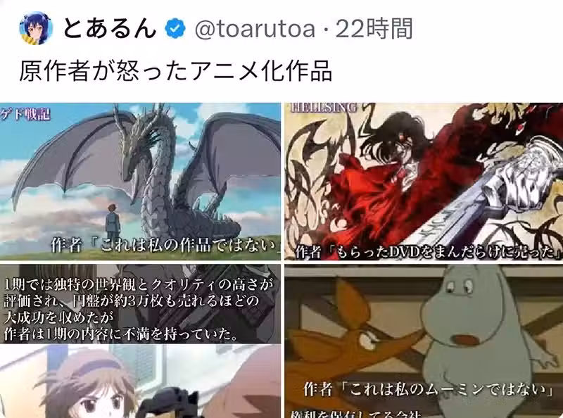 這位暱稱「とあるん」的日本X網友,最近發文聊起了因為改編品質不符預期,導致惹原作者生氣,甚至都不願意承認的動畫化作品。