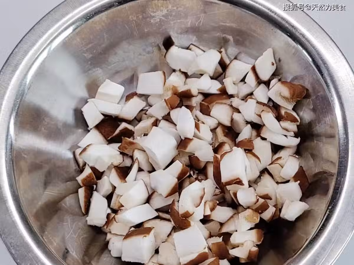 2、胡蘿蔔可以豐富菜肴的營養,也可以起到一個配色的作用,為了菜肴的整體協調性,胡蘿蔔去皮後也切成0.5厘米大小的顆粒。