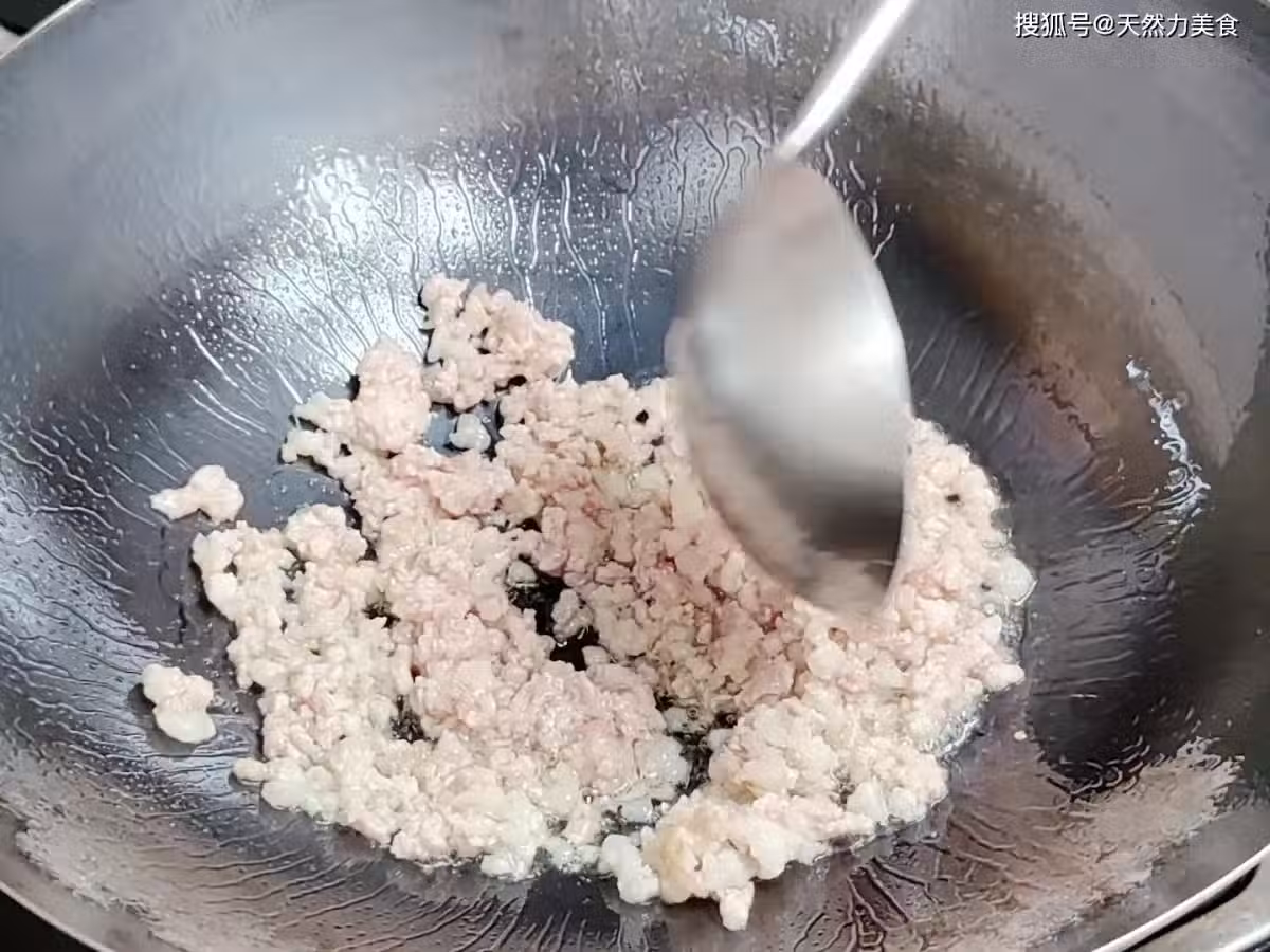 4、看到鍋中的肉末變成金黃色時就加入30克豆瓣醬,和肉末一起翻炒,炒出豆瓣醬的紅油,炒出豆瓣醬豆瓣醬香味,這個過程大概有10秒就能搞定。
