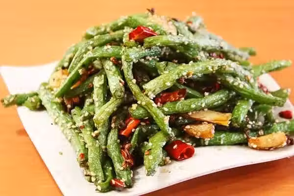 1. 鍋中做油,豆角下鍋,小火煎,煎至表皮微起皺微焦,盛出備用
