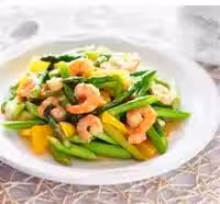 鍋燒熱,放入油,放入蒜末爆香,放入蝦仁炒熟,然後放入蘆筍,放鹽,雞精調味,即可出鍋!