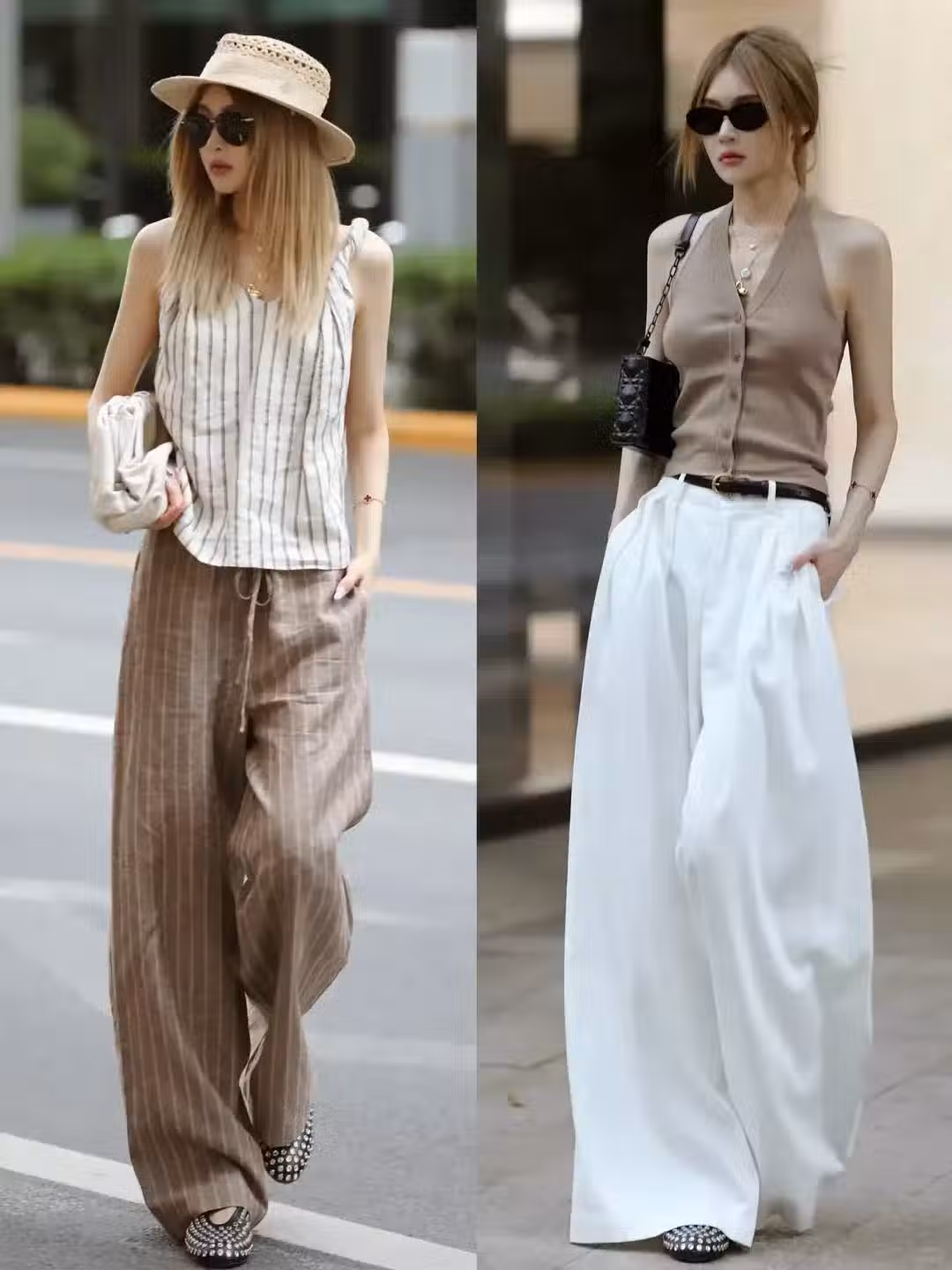 色彩搭配:全白搭配簡約至極,或是選擇淺色系如米白、淡藍、淺灰的闊腿褲,都能營造出清新脫俗的夏日風情。記得利用鞋子或包包的小面積色彩作為點綴,比如一雙亮色涼鞋或一隻精緻的手拿包,讓整體造型更加生動。
