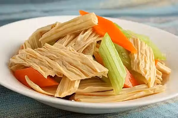 材料:腐竹、胡蘿蔔、黃瓜、蒜、辣椒油、味精、鹽