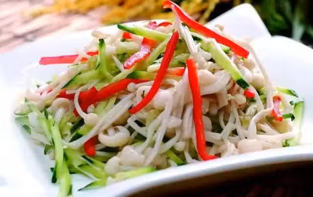 6、將金針菇、紅椒絲,黃瓜絲、步驟4中調好的汁拌均勻,口重的可以加點辣椒油或者辣椒醬