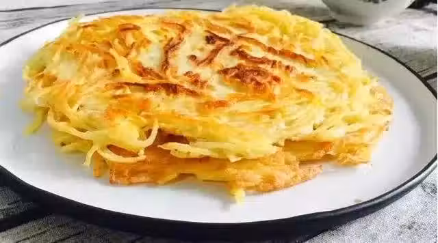 7、平底鍋稍微預熱後刷上一層薄油,改中小火,下入少許土豆雞蛋糊鋪平鍋底煎至兩面熟即可。