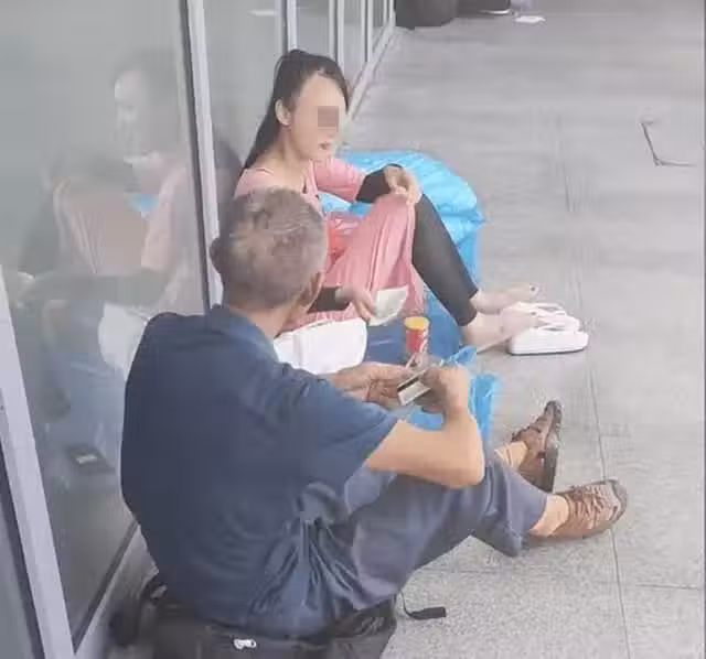 這位女孩是沒錢餓著肚子,在地上坐著找人求助的,而大爺是幫助女孩的人,在聽到女孩肚子餓後,他就去附近買了點吃的給女孩。