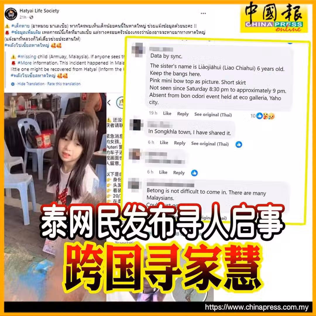 (新山22日訊)「6歲華裔女童失蹤」案;泰國網民也關注廖家慧,將尋人啟事發布在當地社群,呼籲泰國網民協助尋人!
