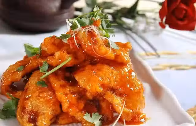 7、放入炸好的肉片翻炒均勻,淋入調汁,大火快速翻炒出鍋即可。
