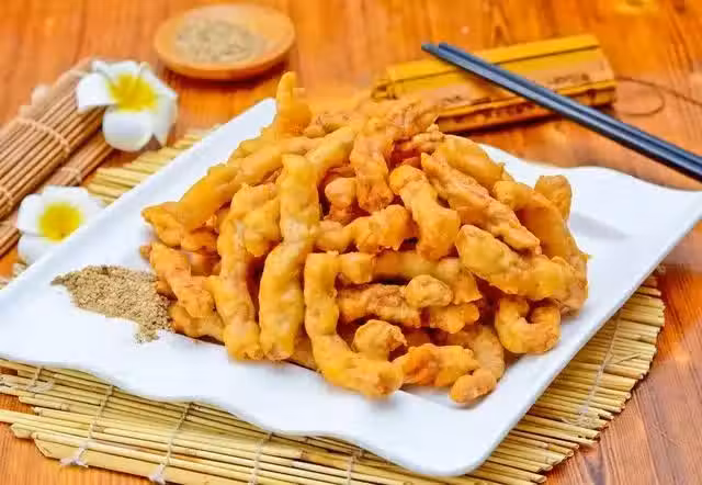 3.顏色變得金黃即可撈出控油,裹上一點椒麻辣椒麵,味道很不錯。