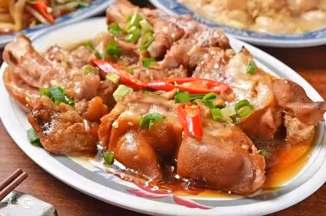 3. 撇凈湯鍋的浮沫,改小火慢煮,直至豬肘熟爛撈出,旺火將醬激發收汁至濃稠,澆入肘子表面,用焯好水的小菜心圍邊即可。