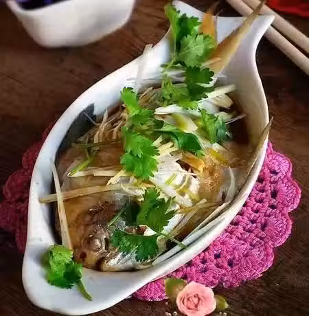 7)把魚取出倒掉湯汁,去掉薑片和蔥絲。