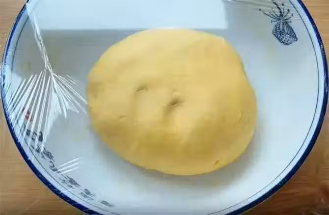 2.準備約400到500克的麵粉,邊倒邊攪拌,這個麵粉的多少取決於南瓜的含水量,攪成面絮狀,加入20毫升食用油,加油能夠使做出的饅頭表皮更加光滑,揉成稍硬一點的光滑麵糰,蓋上保鮮膜醒發至兩倍大,南瓜泥中含有糖分,麵糰會發酵的很快,大約40分鐘就可以。