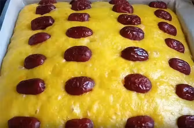 6.當麵糊醒發至原來的兩倍大時,一定不要醒發過頭,如果醒發過了的話,麵筋支撐不住,這樣我們蒸好的時候就會塌陷,把大棗擺在上面,涼水下入蒸鍋,因為水燒開的過程也是酵母發酵的過程,如果是熱水下鍋的話,酵母直接就被燙死了,這樣就沒有醒發過程了,我們全程用大火蒸,大火能夠使發糕的內部組織快速定型,防止塌陷,蒸20分鐘左右,我們關火燜五分鐘即可出鍋。