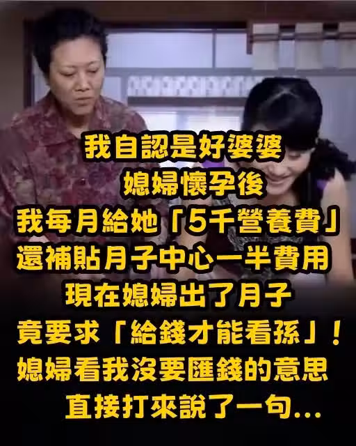 我自認是好婆婆,媳婦懷孕後,我每月給她「5千營養費」、還補貼月子中心一半費用,現在媳婦出了月子,竟要求「給錢才能看孫」!媳婦看我沒要匯錢的意思,直接打來說了一句...