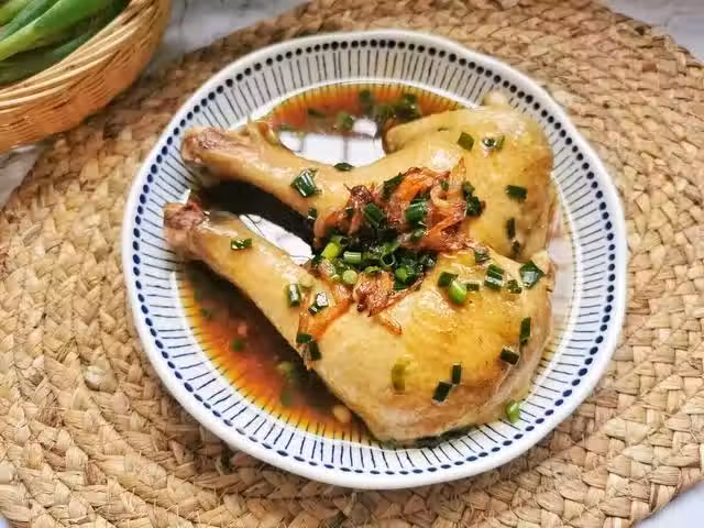 4、碗中倒入切好的小香蔥,將熱油倒進去,這樣蔥香味完全被激出來了,加入兩勺醬油、一茶匙白糖攪拌均勻,將蔥油醬汁淋在雞腿上就可以了。