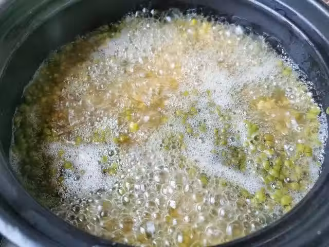 6、蓋上蓋子繼續燜15-20分鐘,此時綠豆就已經粒粒開花了,但是綠豆和綠豆湯的顏色還是碧綠的,用勺子按壓攪動,一鍋好喝的綠豆湯就做好了。