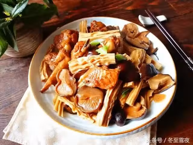 6.加入香菇翻炒均勻,淋入適量熱水,和雞翅平齊,大火燒開,轉小火燒制入味,燒制剩少許湯汁時,加入腐竹,鹽,翻勻,繼續燒制5-6分鐘,將腐竹燒制入味,關火,盛出裝盤即可