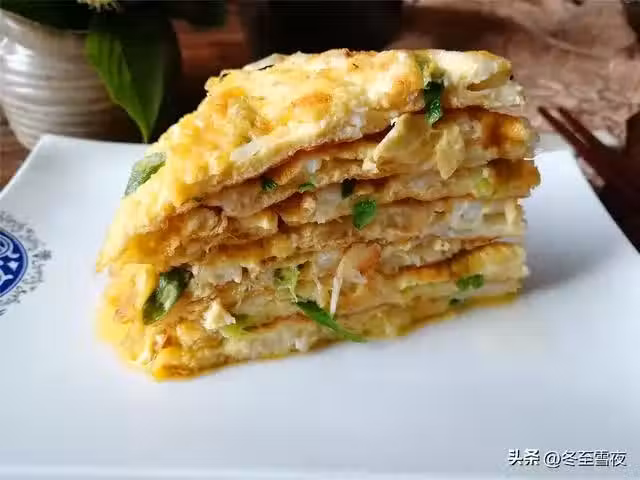 4.鍋內加入油燒熱,淋入拌好的雞蛋液,隨即將鍋微微轉動,使蛋液攤開,呈圓形的蛋餅狀,再用小火煎制。