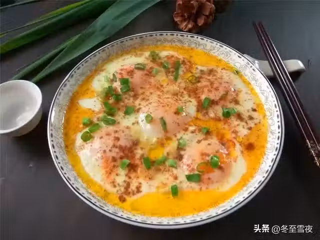 【臥雞蛋】所需材料:雞蛋5個、蔥1段、油半湯匙、花椒粉少許、生抽2湯匙、